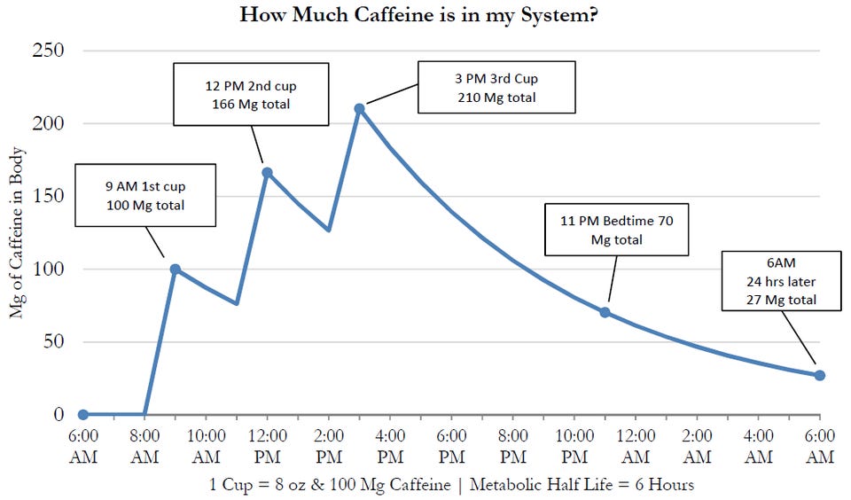Caffeine in the body is halved every 5-6 hours. A Reddit user made a diagram showing the amount of caffeine in the body during a day with 3 cups of coffee at 9 AM, 12 PM, and 3 PM.